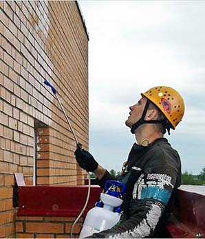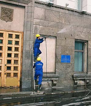 Для очистки фасадов сооружений используют щелочные и кислотные моющие средства. Чтобы очистить поверхность зданий, придерживаются следующих правил при мойке: